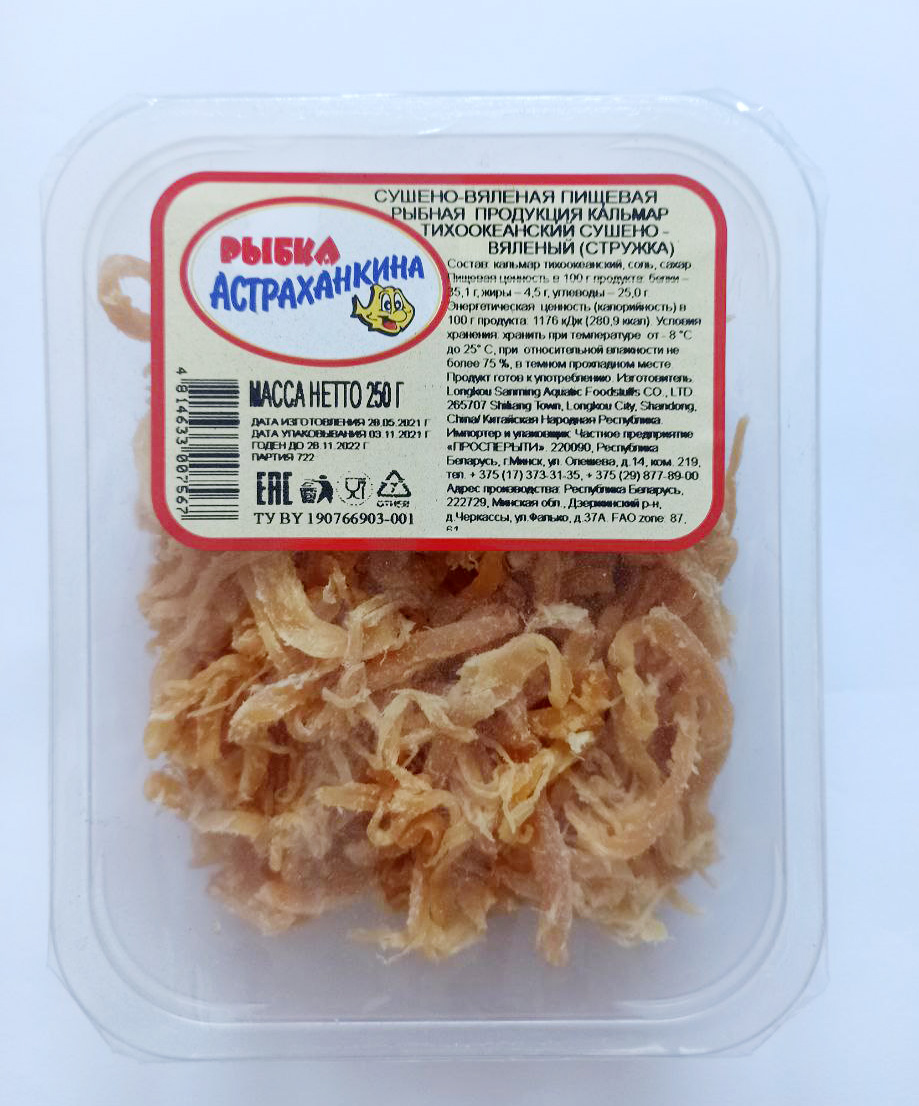 Сушено-вяленая пищевая рыбная продукция. Кальмар тихоокеанский сушено-вяленый (стружка) 250 г.