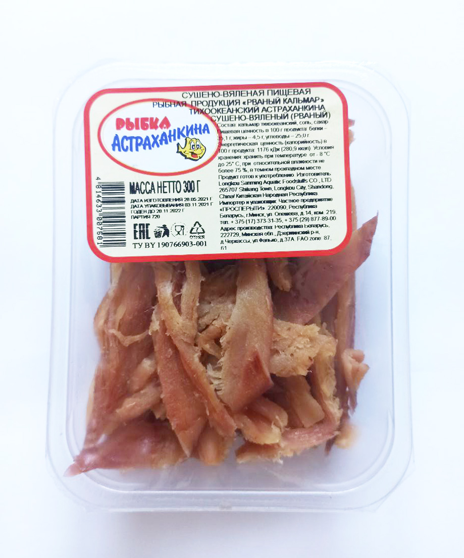 Сушено-вяленая пищевая рыбная продукция. "Рваный" Кальмар тихоокеанский сушено-вяленый (рваный) 300 г.