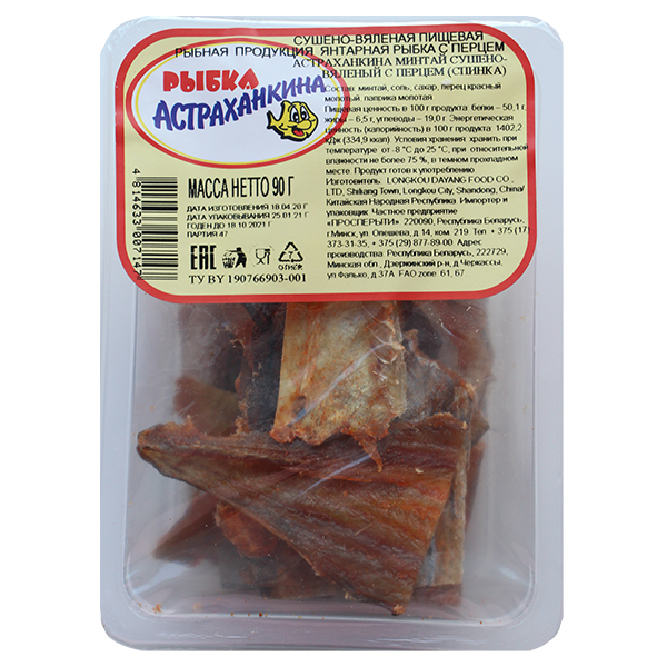 Сушено-вяленая пищевая рыбная продукция. "Янтарная рыбка с перцем" минтай сушено-вяленый с перцем (спинка) ТМ Астраханкина 90г