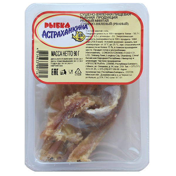 Сушено-вяленая пищевая рыбная продукция. "Рваный" минтай сушено-вяленый (рваный) ТМ Астраханкина 90 г